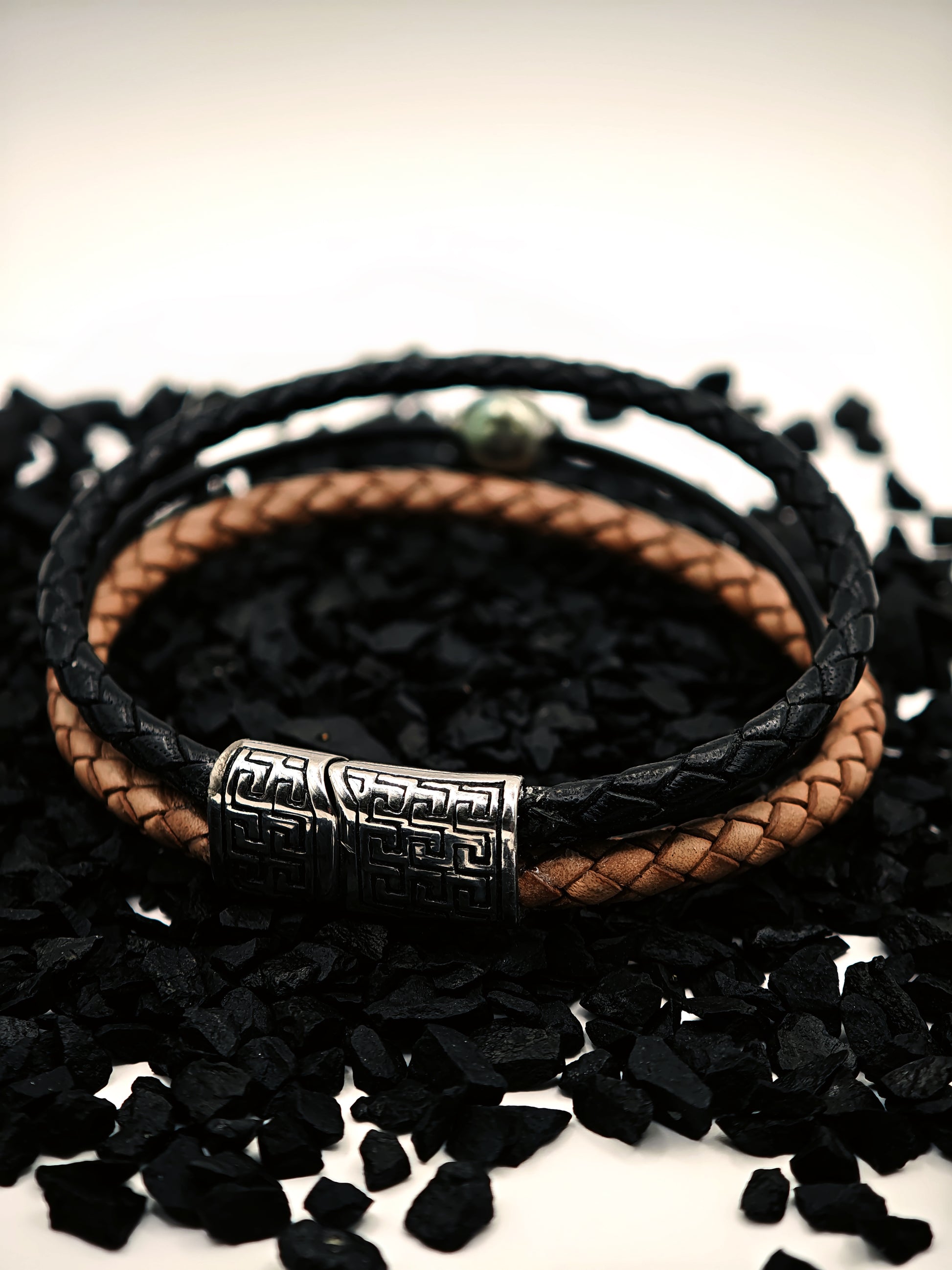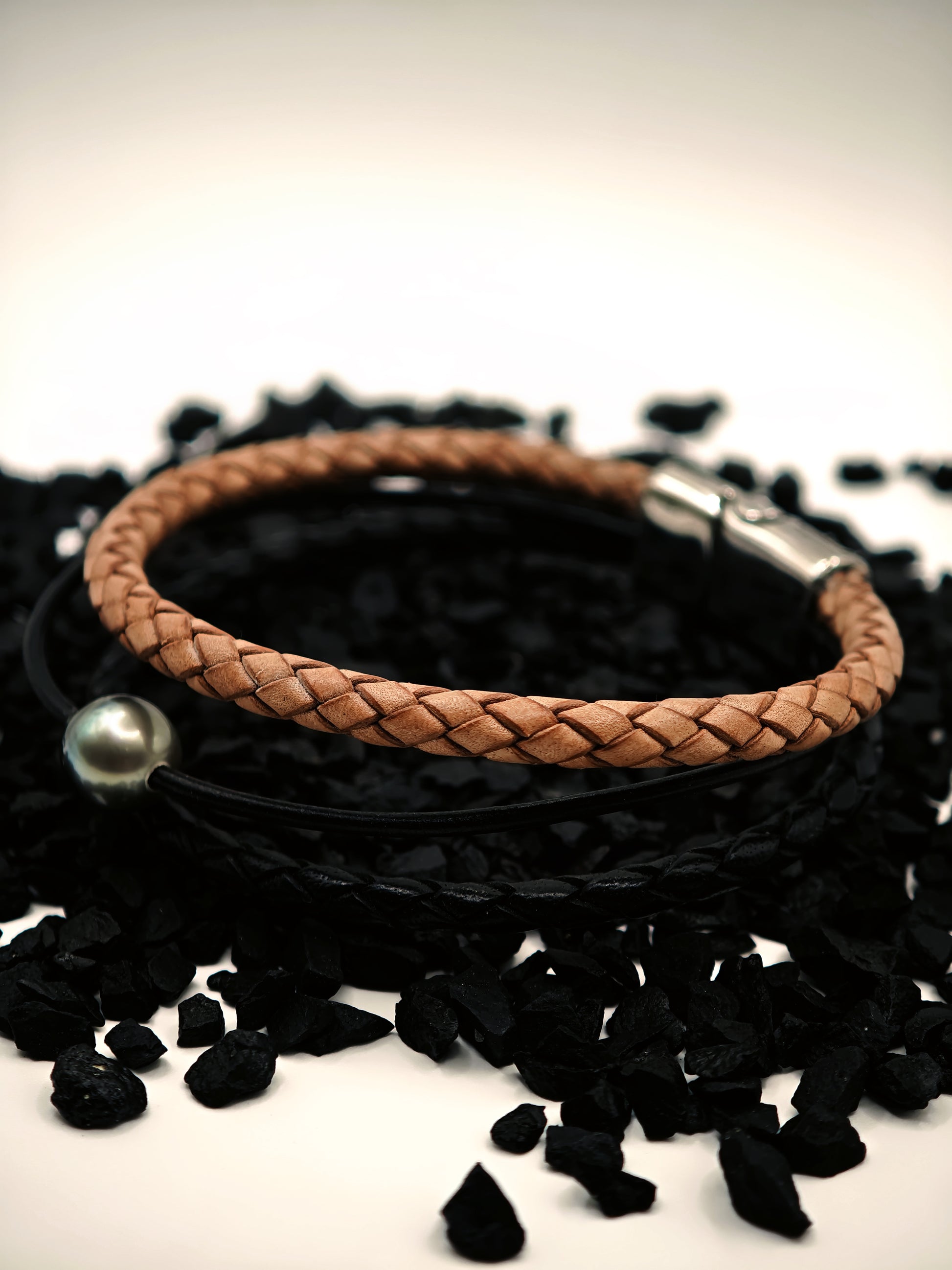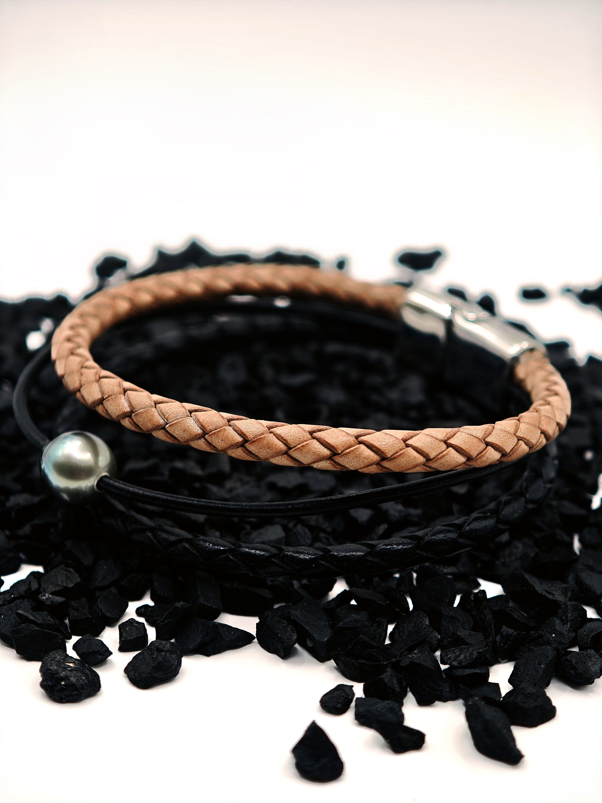 Bracelet en cuir tréssé avec une perle gravée par nos soins de Tahiti de 12mm.