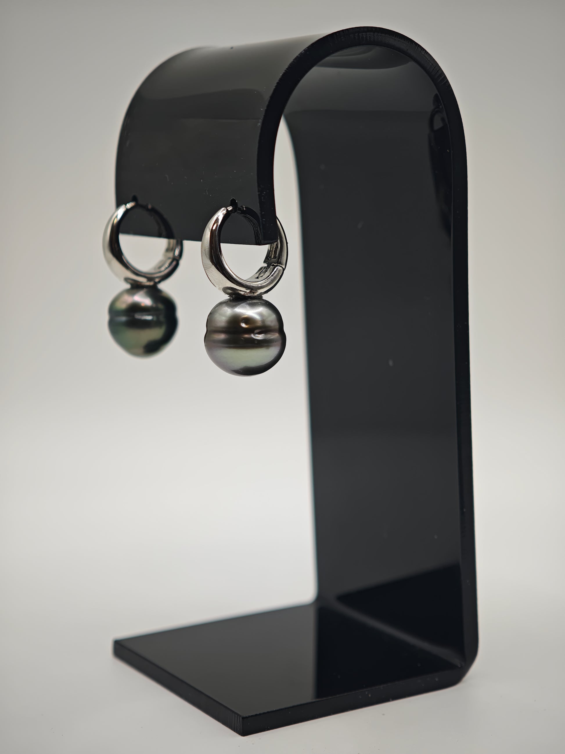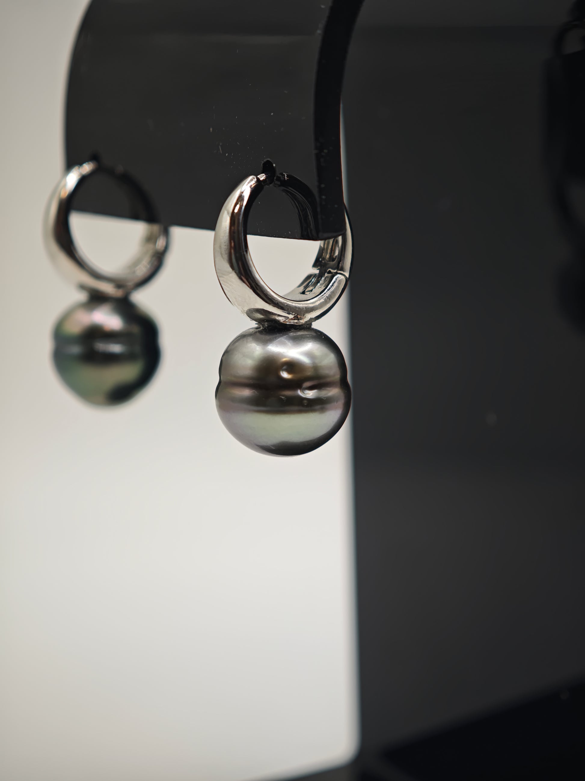 Boucles d'oreilles avec deux perles de Tahiti de qualité C de 12mm cerclées.